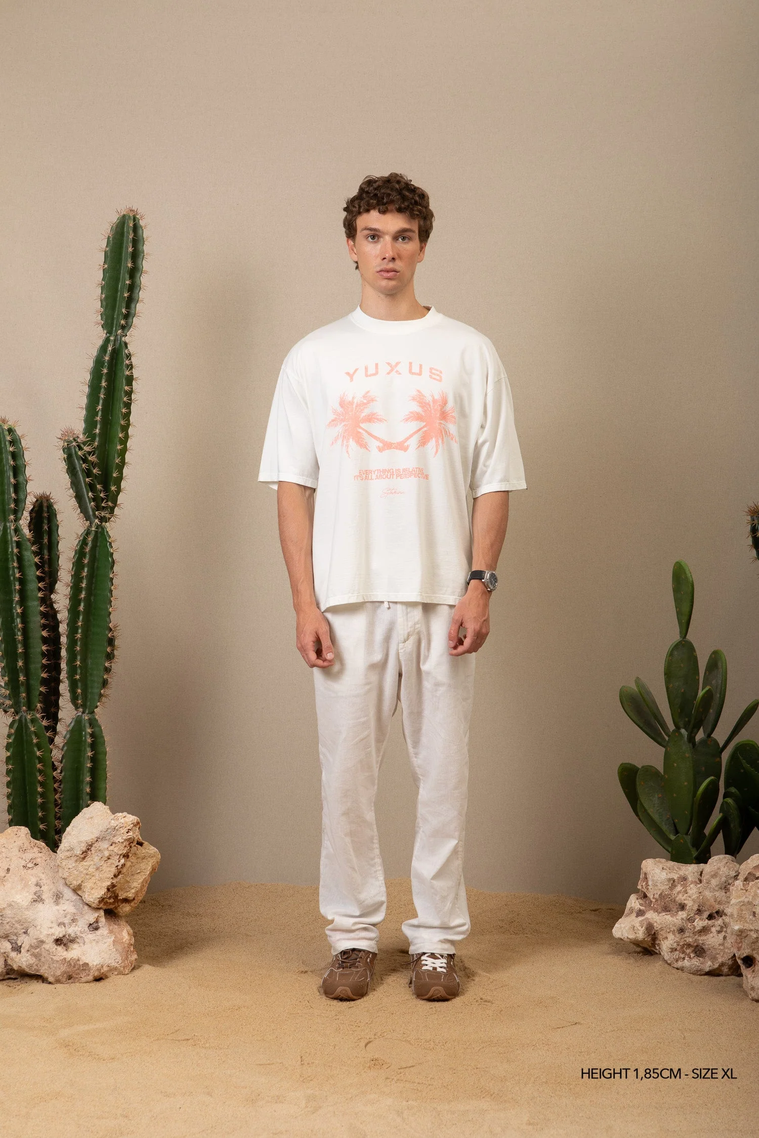 Introducing the Stamina tee in hazel beige color, a clean and refreshing take to represent the spirit of a permanent vacation. The capsule embodies the summer season with relaxed fits, light textured fabrics and hues of antique whites, royal blues and pastel tones reminiscent of a summer sunset.