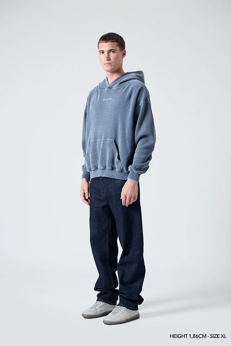 Introducing the waffle hoodie in indigo blue colour. A slightly oversized hoodie, crafted from a heavyweight jersey and manufactured using the “waffle” technique for our most leading-edge collection to date. Shaping innovation, driving the change.